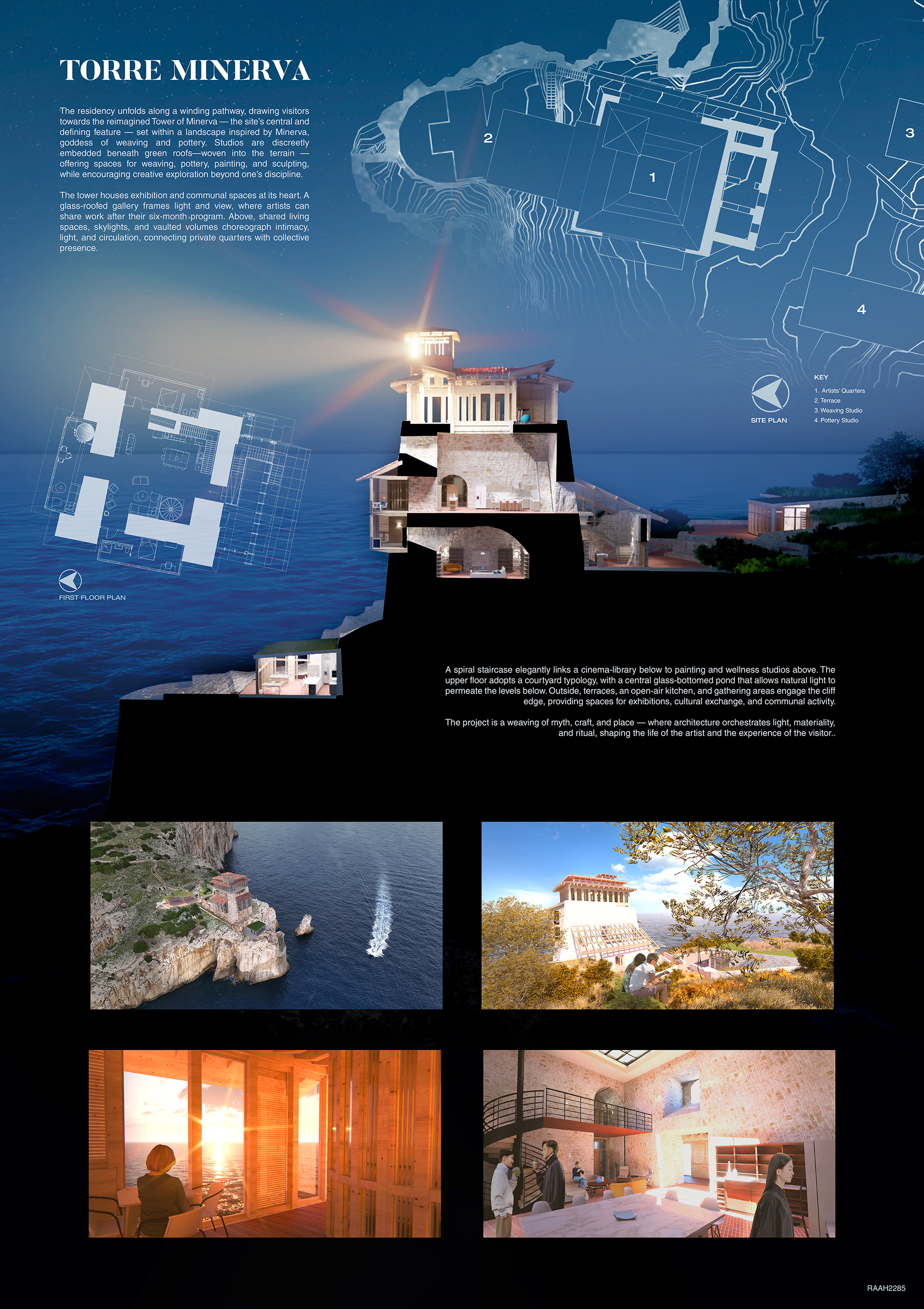 For this competition, facilitated by reuseitaly.com we aimed to reuse and repurpose the ruins of a promontory watchtower at Punta Campanella, just beyond Sorrento, Italy. We reimagined the ruins as an artist residency where artists could be immersed in this highly unique and secluded context and in the craftsmanship of it's antiquity.