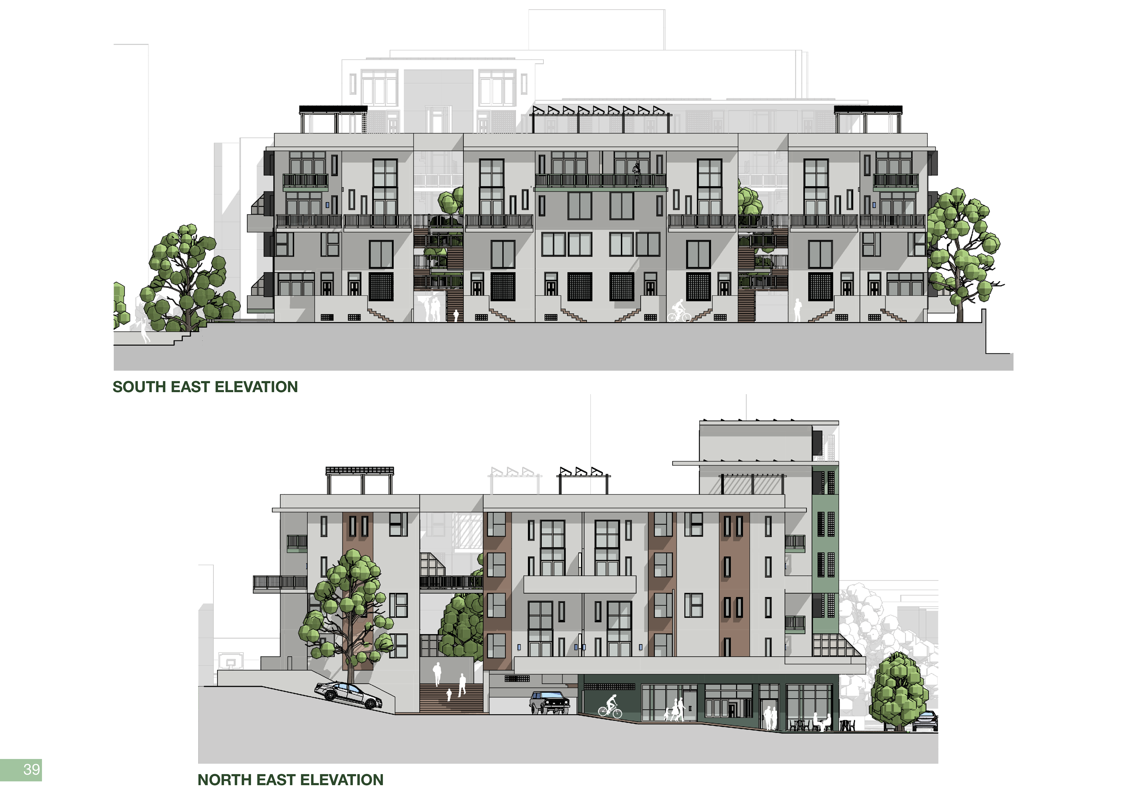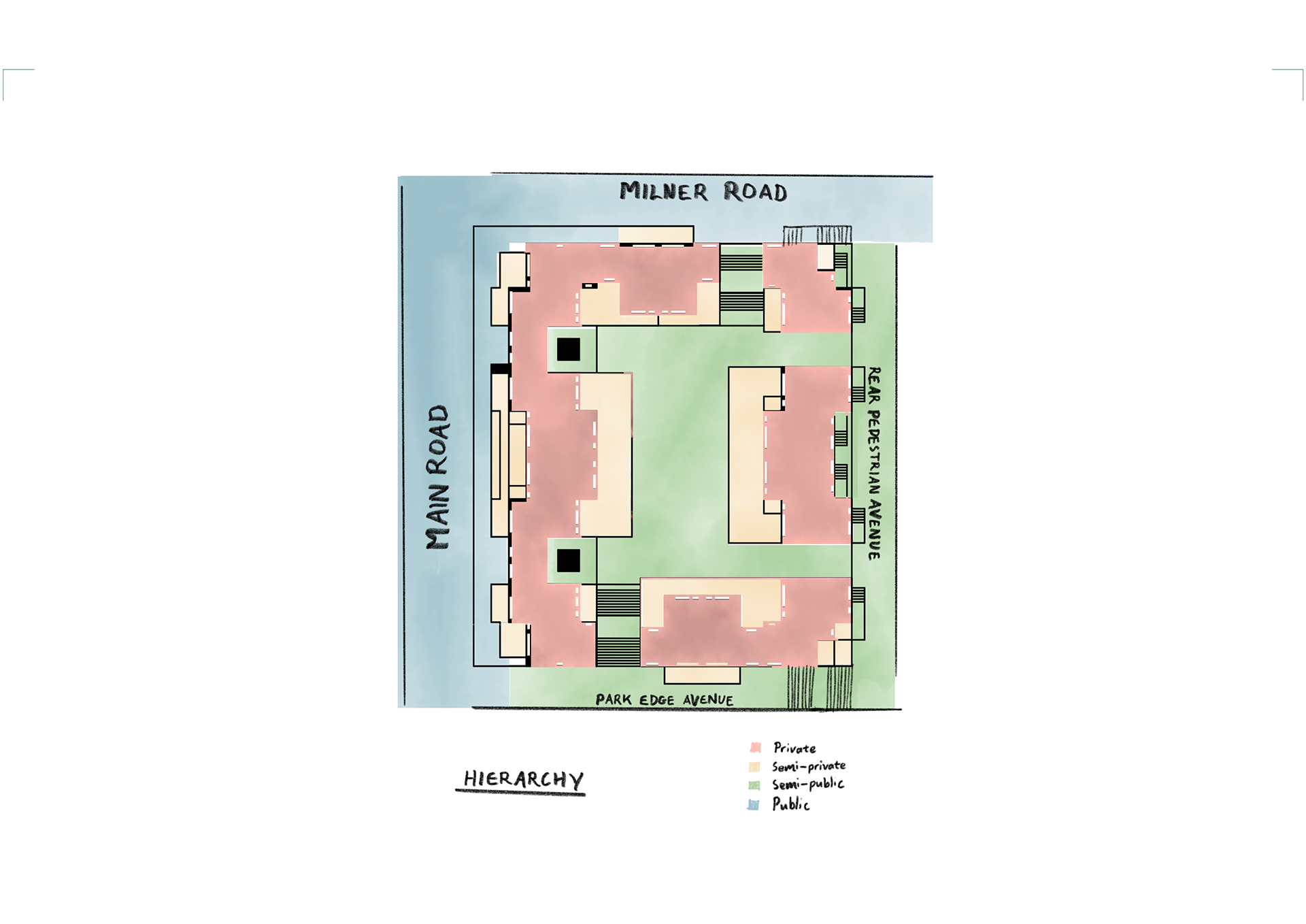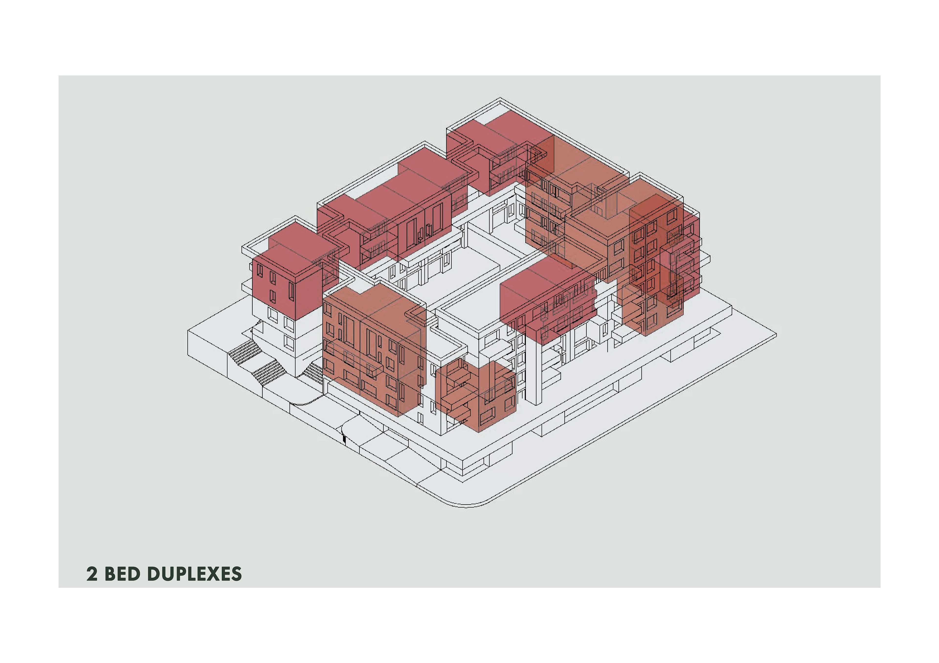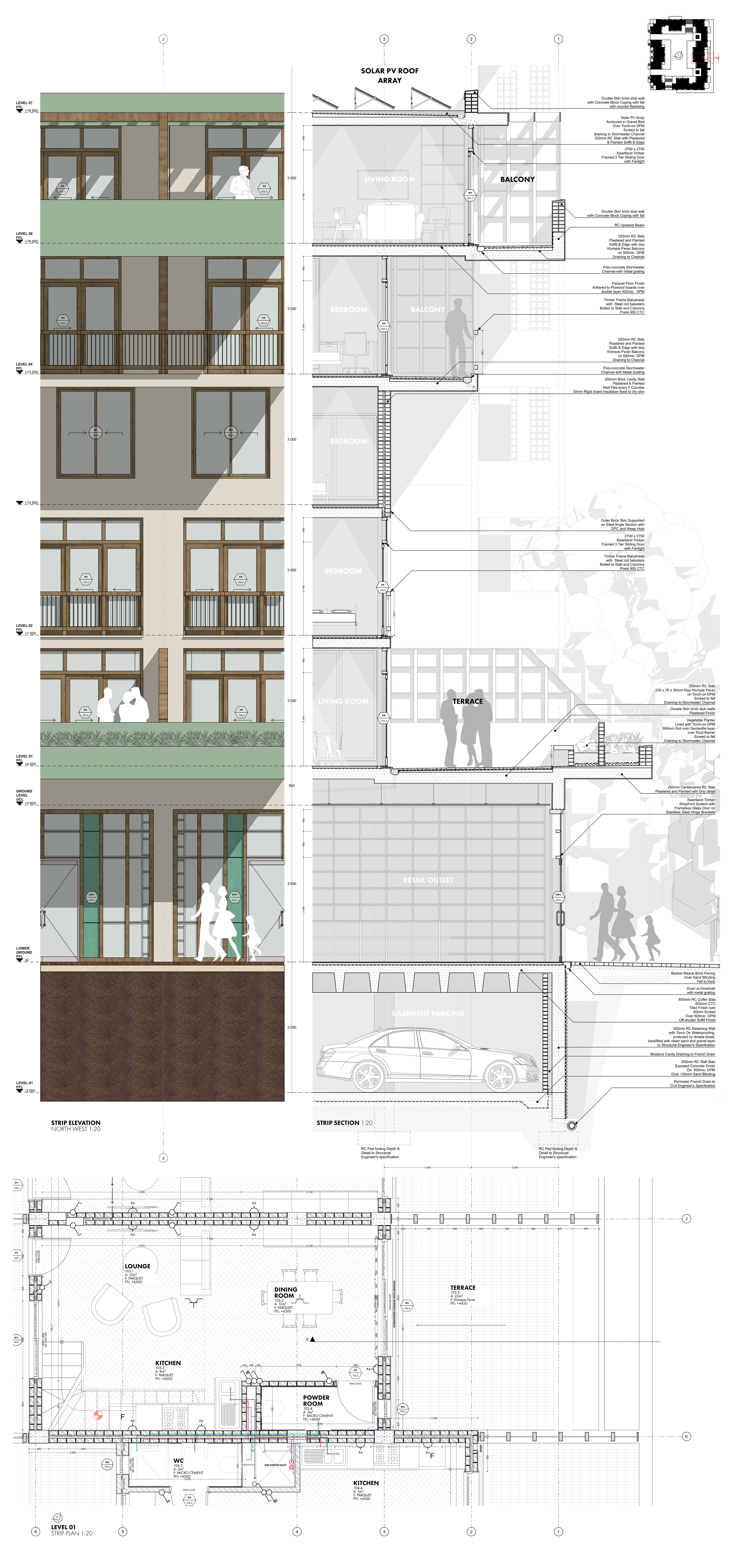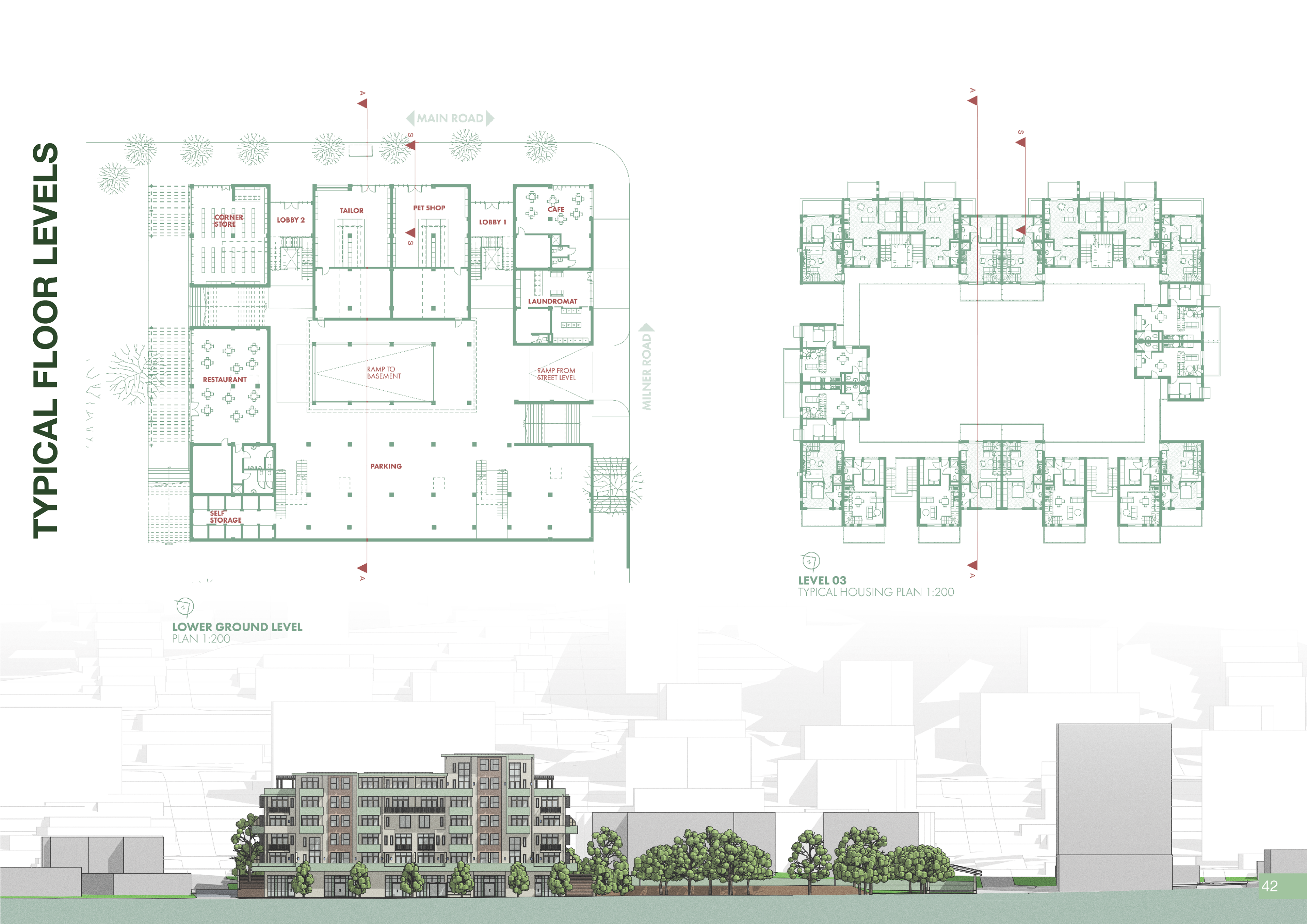 The program of Tafelberg Terraces integrates diverse apartment types with an active public edge to foster community and comfort. The three-bedroom family duplexes are positioned on the upper ground level, allowing generous private outdoor areas where children can play safely. The Main Road edge is animated by a café, tailor, pet shop, and corner store, while the side street accommodates a laundromat serving both residents and the surrounding neighbourhood. Along the park-side pedestrian avenue, a restaurant and the shared corner store create a lively yet intimate public interface. These retail and service spaces form a lower-ground podium beneath the residential levels, buffering the homes from street activity, reducing noise, and enhancing privacy for residents above.