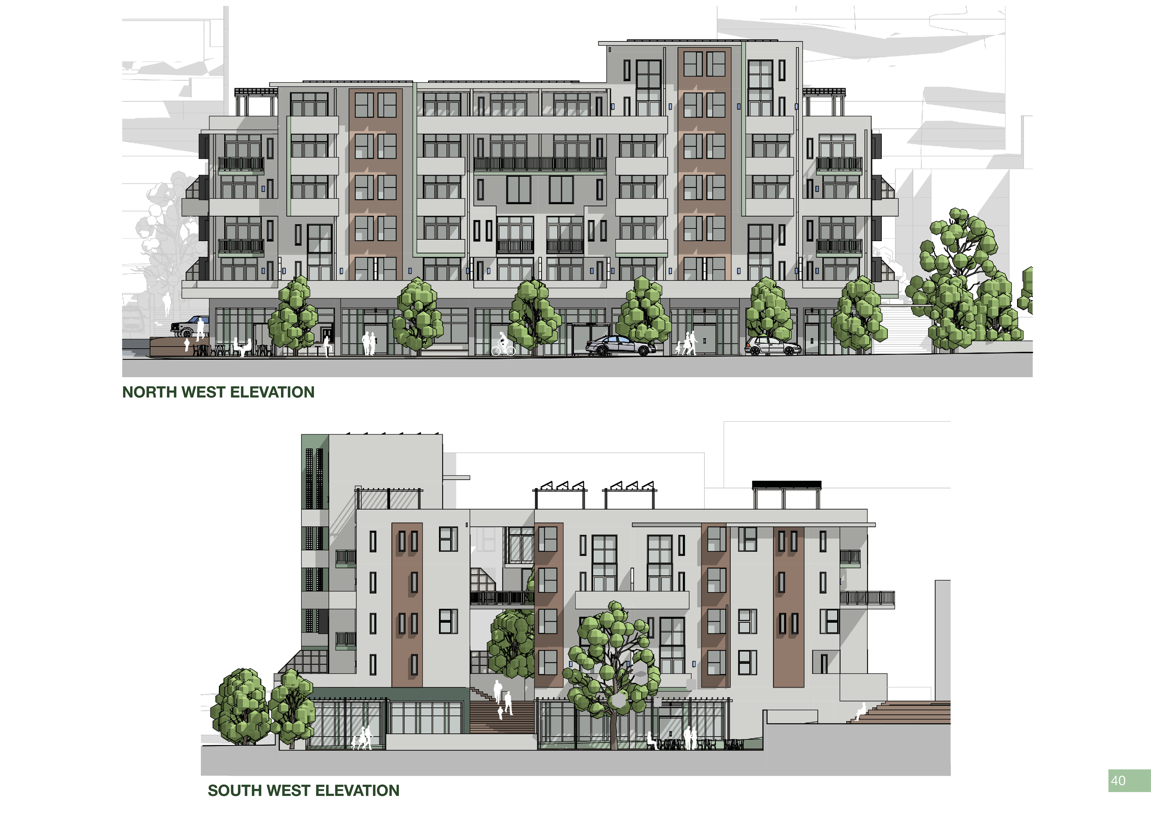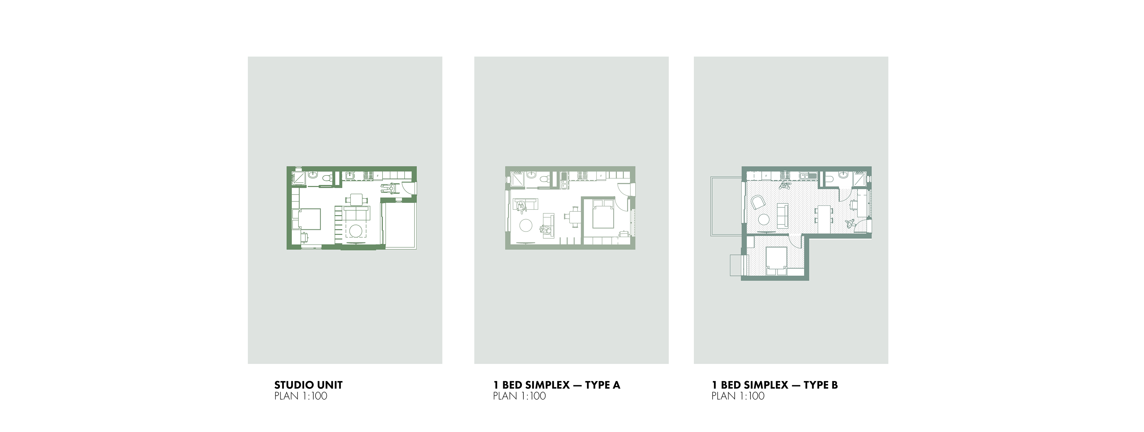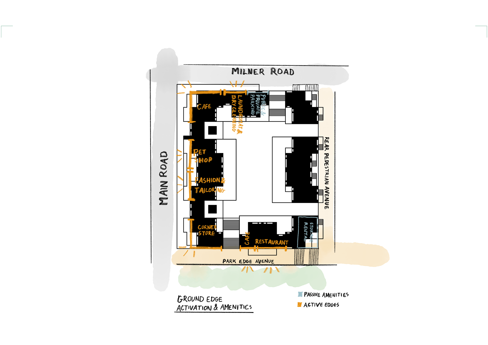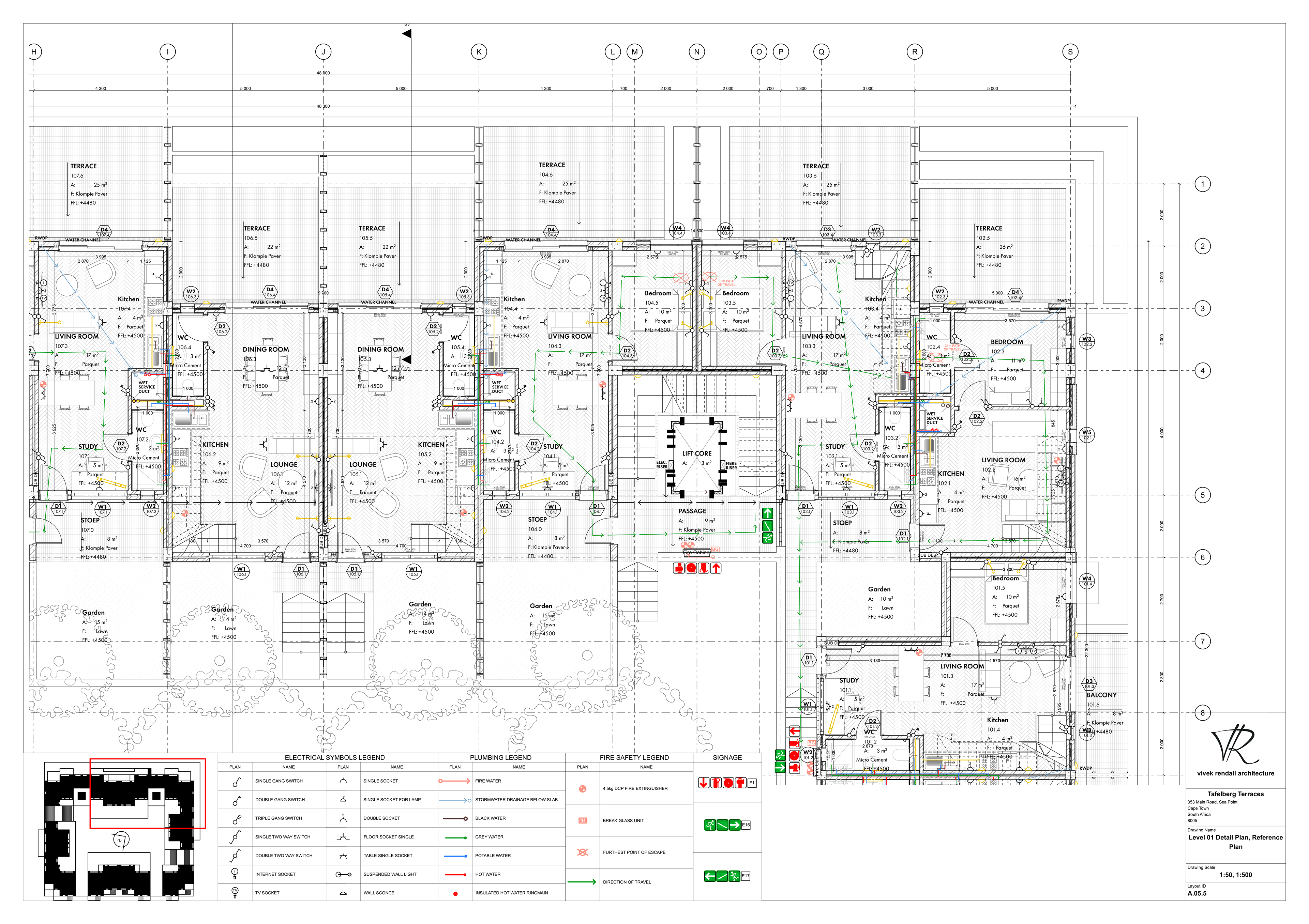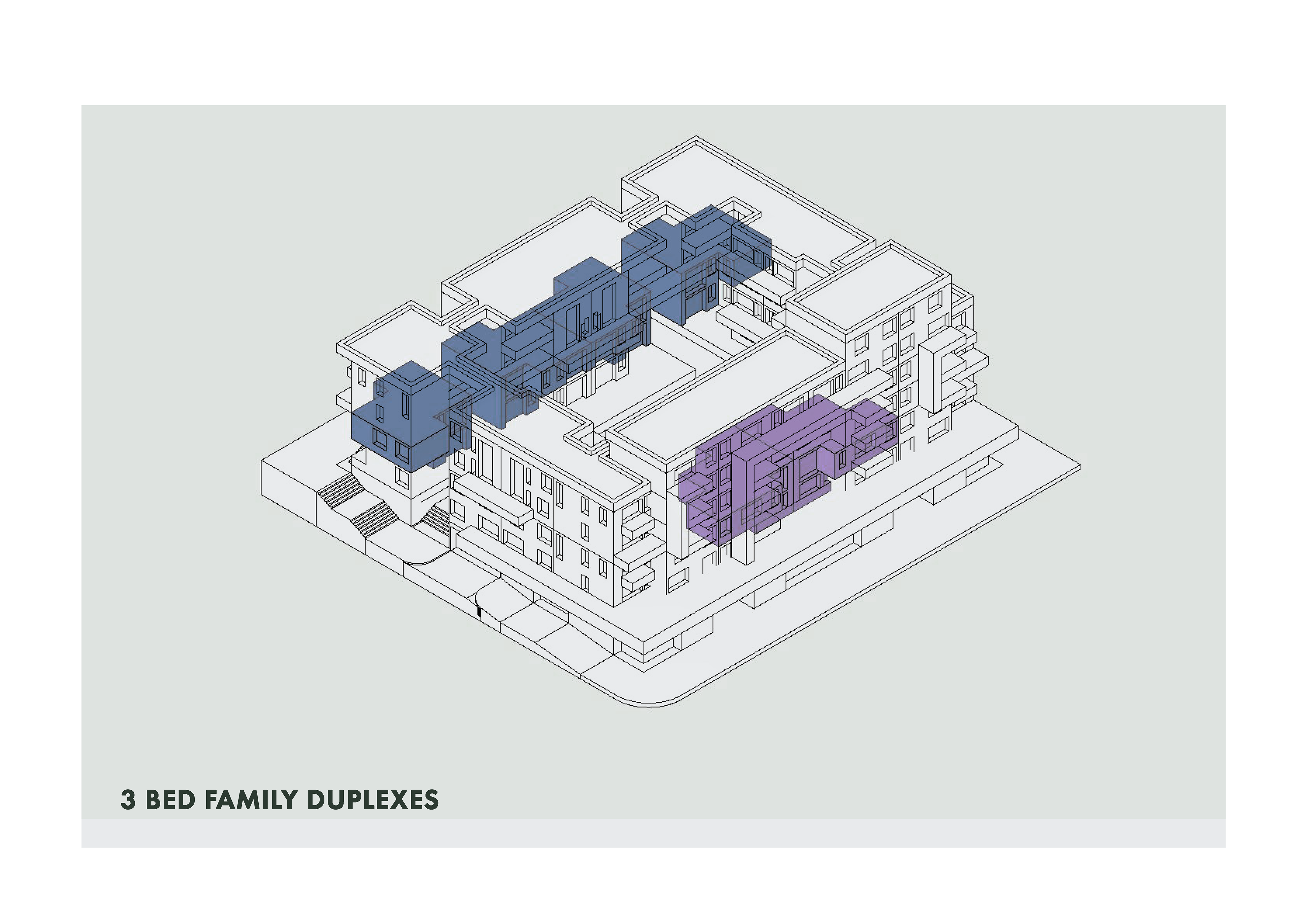 The program of Tafelberg Terraces integrates diverse apartment types with an active public edge to foster community and comfort. The three-bedroom family duplexes are positioned on the upper ground level, allowing generous private outdoor areas where children can play safely. The Main Road edge is animated by a café, tailor, pet shop, and corner store, while the side street accommodates a laundromat serving both residents and the surrounding neighbourhood. Along the park-side pedestrian avenue, a restaurant and the shared corner store create a lively yet intimate public interface. These retail and service spaces form a lower-ground podium beneath the residential levels, buffering the homes from street activity, reducing noise, and enhancing privacy for residents above.