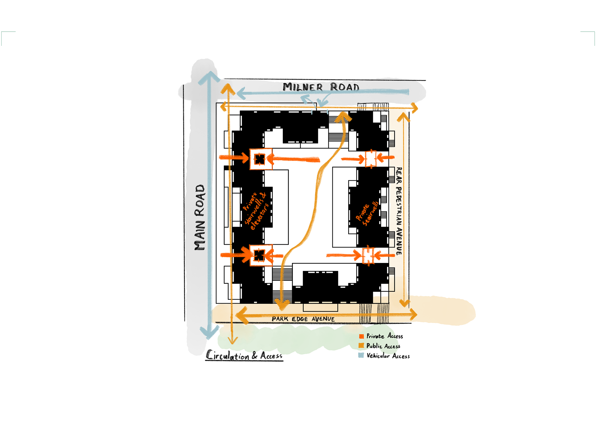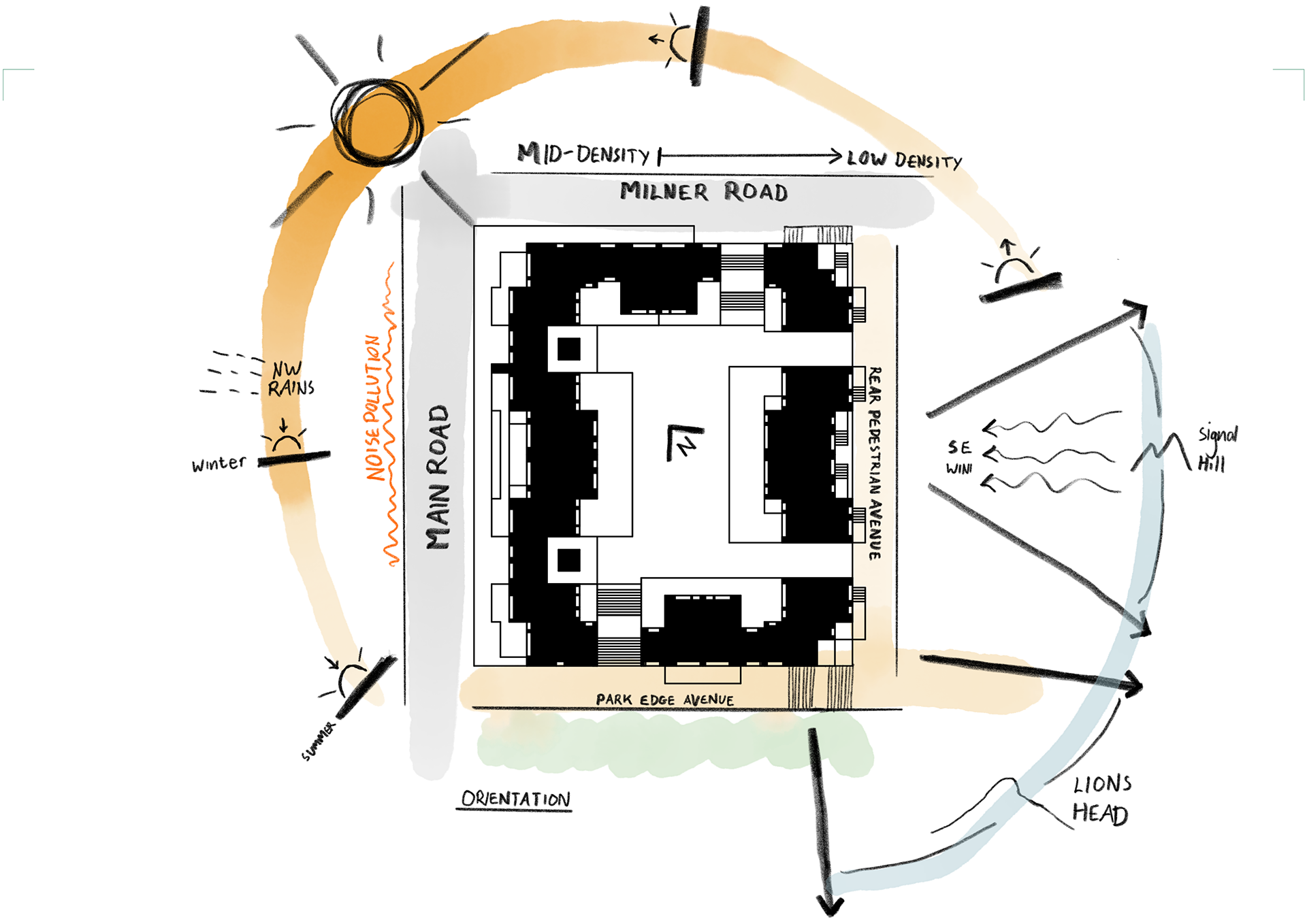 Small openings along the courtyard’s edge walls bring fresh air into the parking and retail levels below, merging environmental function with architectural expression. The massing steps down toward the residential hinterland, preserving views to Lion’s Head, Signal Hill, and the Atlantic.