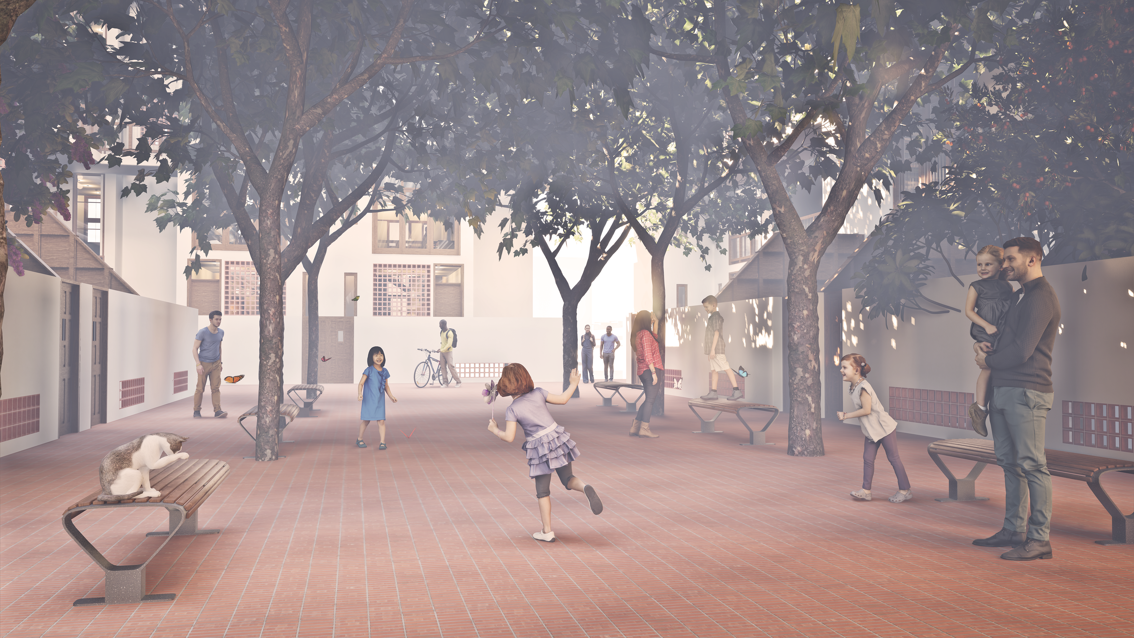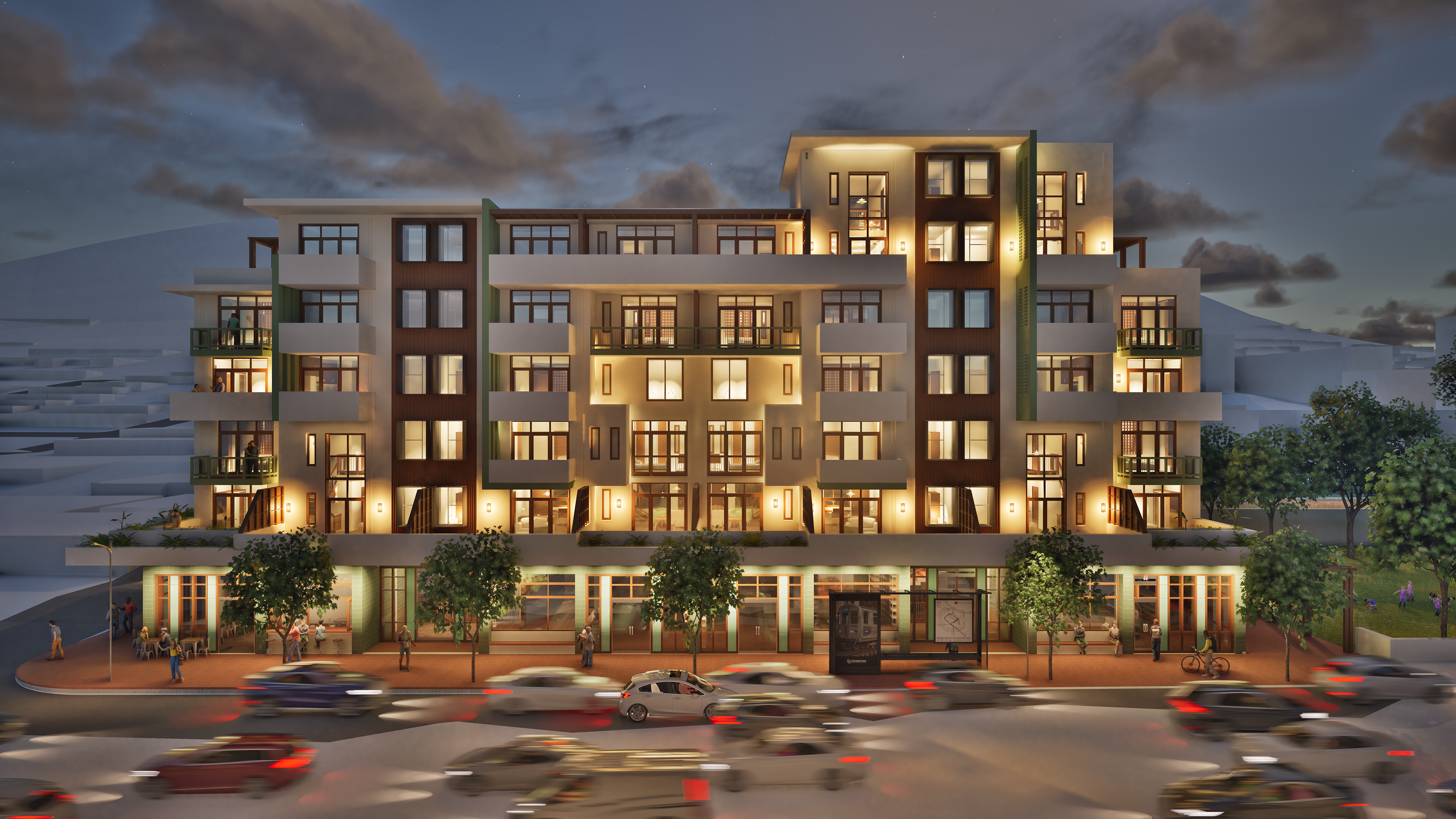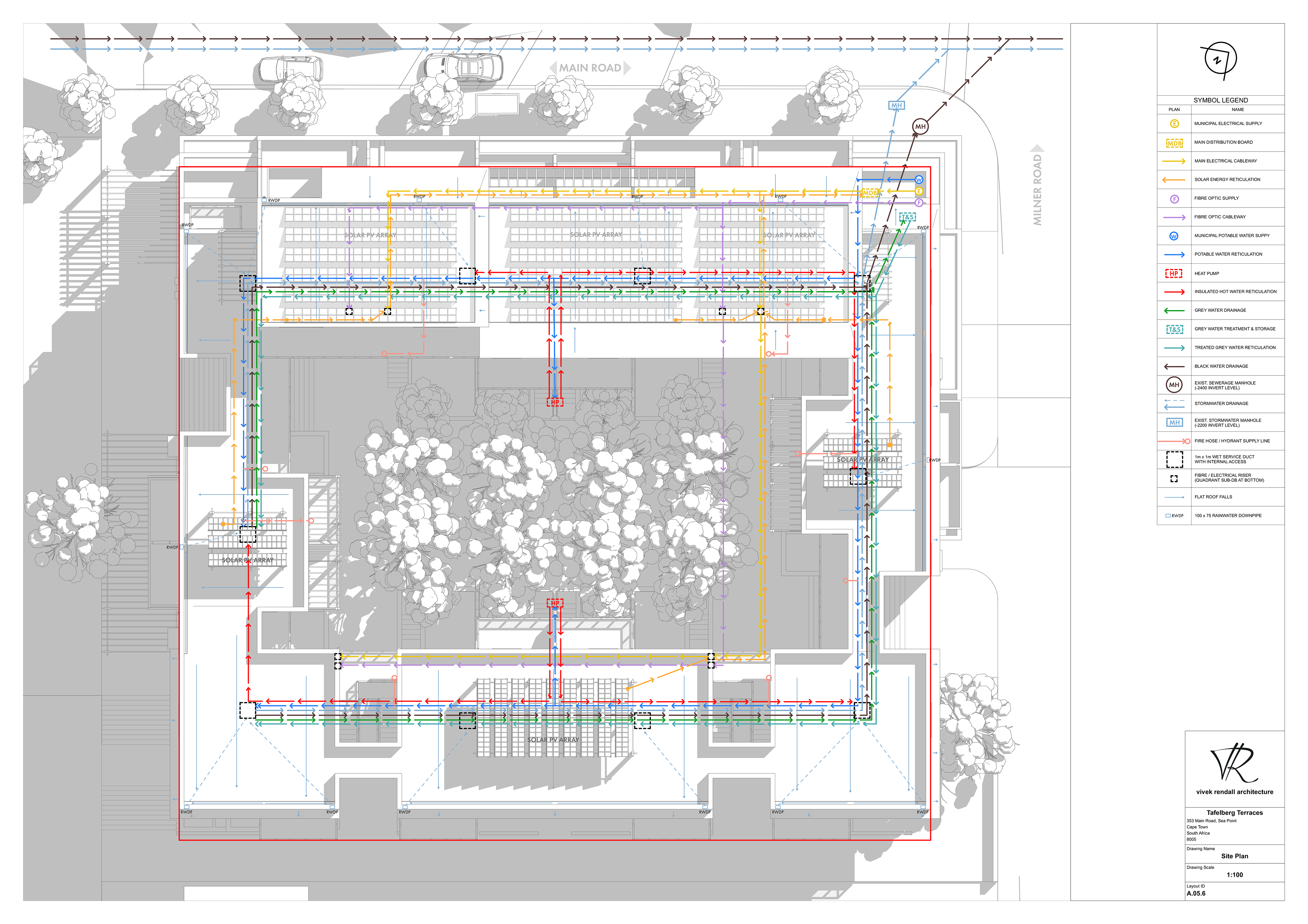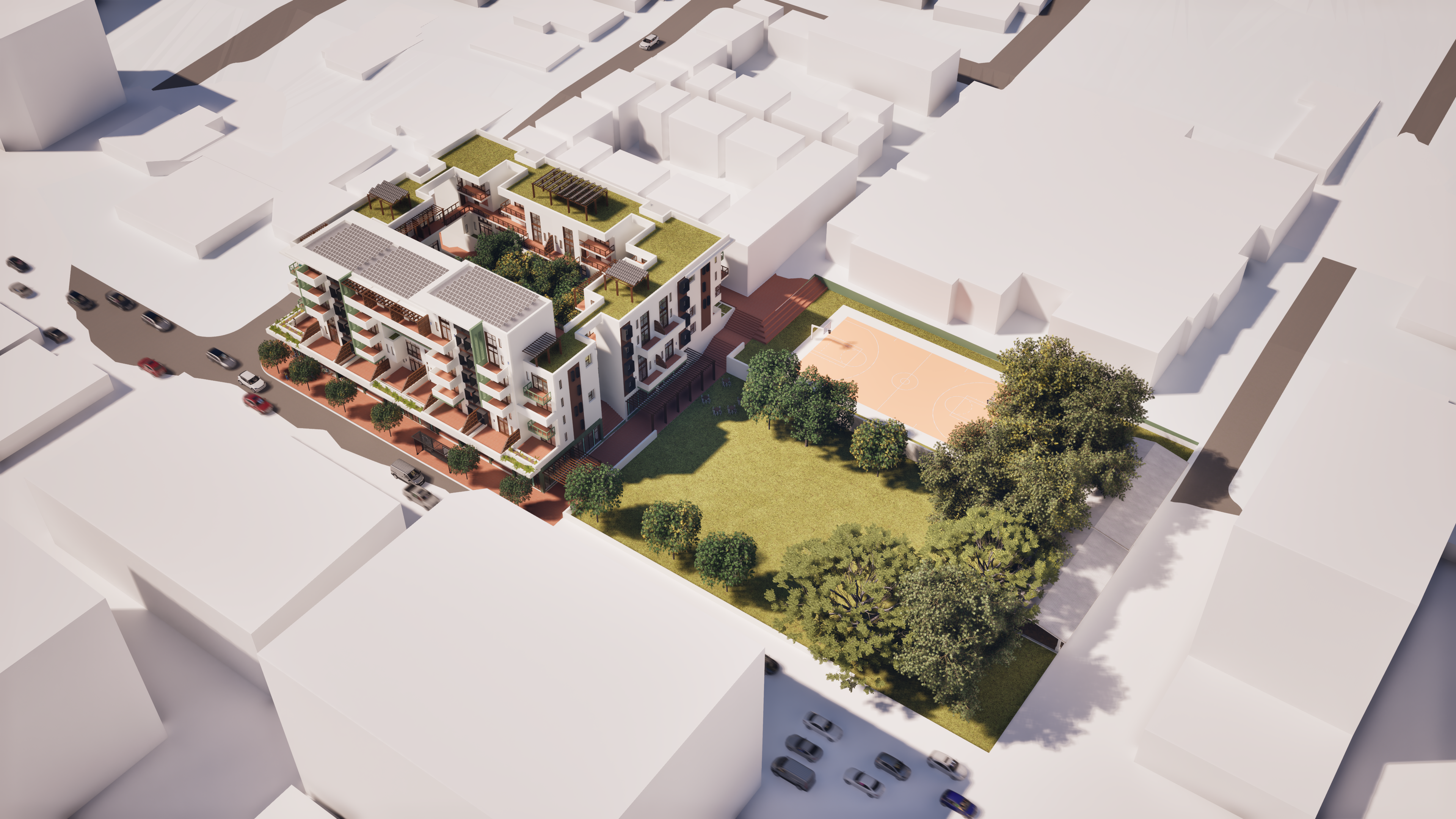 Tafelberg Terraces reimagines mixed-income urban living on the former Tafelberg School site in Sea Point, countering gentrification by restoring social diversity to the inner city. Inspired by the courtyard blocks of Berlin and Paris, two L-shaped residential wings frame a communal courtyard above a publicly activated podium of local shops and cafés.